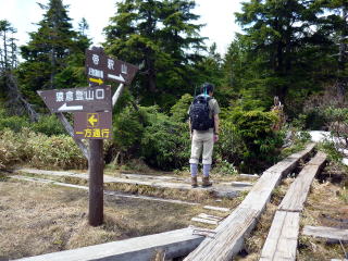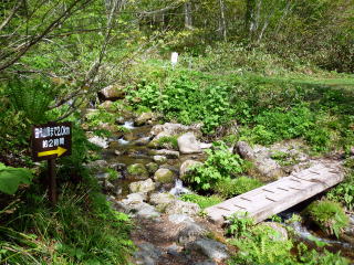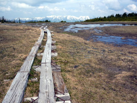 水場を過ぎて間もなく、熊避けのための大きな鐘が設置されていた。 人里離れた山奥の登山口のため、大きめの鈴を携行していったが、注意書き通りに鐘を 鳴らし進む。この先もう一箇所、同じ鐘が設置されていた。 ![]() 9:35 小田代通過。 ![]() 木道が終わり、樹林帯の急登を経て再び木道が現れると、田代山の湿原の一角、弘法沼 越しに、絵になる光景が広がる\(^o^)/ ![]() 湿原の木道は一方通行で、山頂を経てぐるりと一周できるようになっている。 今年は雪融けが遅かったためか、湿原内では、お花は数輪しか見られず残念。