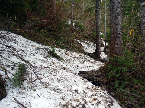 帝釈山への道は、一旦下り、下りきると巻き道を行く。 夏道を行くが、一部残雪を踏むことになる。 急坂を下り始めて間もなく、登山道両脇に、背丈の低い初めて見るお花現る! 事前にネットでも見てこなかったので、蕾を沢山付けたシダ状の葉を持つこの植物が、 オサバグサだとは分からなかったが、葉だけのものも群生しておりとても目を惹く。 もしかして、オサバグサ!? 帰宅後調べると、やはりオサバグサであった(^^)v では、オサバグサ特集をどうぞ↓(各画像はクリックで拡大します) ![]() 巻き道には残雪があった 道は再び登り返し、山頂に近付くにつれ傾斜も急になり、頂上直下は岩っぽく歩きづらい。 11:10−25 帝釈山(大休止・パン) ![]() ![]() 山頂より望む会津駒 ↓燧ヶ岳 ↓至仏山 ![]() 写真では上手く撮れなかったが、肉眼では先日歩いた日光連山や奥白根山、平ヶ岳や 越後駒なども見える♪ 帰路は、往きに見たオサバグサの蕾が少しでも開いていることを期待しながら、また、他の 花の撮影もしながら行く。 ※画像はクリックで拡大します↓ 12:25−35 田代山避難小屋(小休止) 12:55 小田代通過。 13:30 猿倉登山口P着。 |