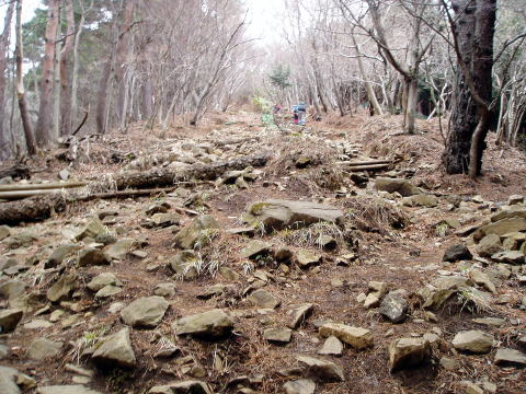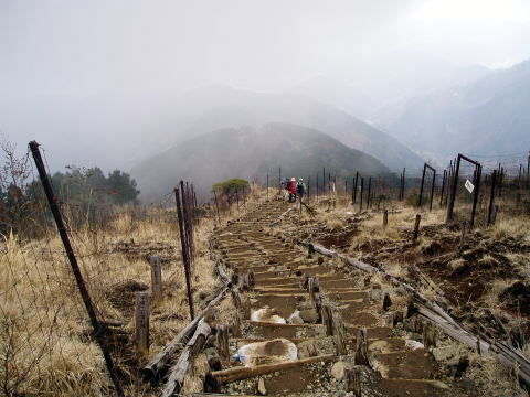 大倉バス停 9:15〜10:40 堀山の家 10:45〜12:05 塔ノ岳 12:35〜 13:10 堀山の家 13:15〜14:05 大倉バス停着。 大倉バス停周辺は整備されている。 靴洗い場まである立派なトイレ↓ ![]() 9:15 身支度を整え大倉バス停出発。 9:25 大倉登山口通過。 ![]() 一ヶ月前の主脈縦走時には、小屋泊まりとはいえ、ビールやおつまみ、水や お風呂セット等、軽量化を考えずに荷を造り、前日のアルコールも控えなかった ため、ヒーヒーハァハァと、泣きながら歩いたことが思い出される(^^; 今日はトレーニングなので、荷も日帰りセット(雨具、水1.5L、行動食など)で 軽くし、更に前夜禁酒し望む。 前回は大倉高原経由で歩いたが、今回は多くの人が選択する本コースを行く。 10:00 見晴茶屋を通過し、最初の急登、バカ尾根の始まり〜。 ![]() 下界は晴れていたが、登るにつれて雲ってきた。 歩くには丁度いい気温で、一定ペースで淡々と進む。 荷は軽いとはいうものの、駒止茶屋を過ぎるあたりから、あとどれくらいで休憩ポ イントである堀山の家へ着くのだろうと気になり始めてきた(^^; 喉も渇いてきたし・・・。 10:40 堀山の家着。やっと一息いれられる。 ポカリを飲み、日焼け止めを塗ったりと忙しい。 10:45 出発。 いきなりの急登は前回学習済み。 淡々と歩を進める。 ちらほら先行グループにも追いつき、追い越す 11:35 花立山荘通過。 前回と同じく、山荘前は休憩する人で賑わっていた。 ![]() 正面に見えるはずの、目指す塔ノ岳は雲の中。 休憩したい気持ちを堪えて、淡々と行く。 12:05 塔ノ岳着。あ〜〜、これで登らずに済むというのが正直な感想。 登山口からここまで、2時間40分(小休止込) 亀足ハイジとしては、まずまずというところか・・・(^^; 行動食のパンを食べ、テルモスのほうじ茶で寛ぐ。 正面にど〜〜んと富士山が見えるはずだったのだが、残念ながら雲の中。 ↓丹沢山方面 ![]() 塔ノ岳山頂より(雲の中の)丹沢山方面を望む 12:35 大休止を終え下山にかかる。 ![]() 急勾配の階段道 山頂直下から、いやというほど階段道が続く。 雪はないので、うんざりしつつもどんどん下る。 13:10 堀山の家着。小休止。 13:15 出発。 下ってみると、登りの辛さがわかる。膝の弱い人だと、下りも辛い道である(^^; 登りよりは下りの方が得意?なハイジは、足取りも軽い。 14:00 大倉登山口通過。 14:05 大倉バス停着。 14:08発の渋沢行きバスがあったのだが、靴やスパッツの泥を落としたり、身支 度を整えるため見送り、14:38発のバスで帰路に就く。 ここから自宅まで、3時間はかかるのだぁ〜〜〜(^^; |