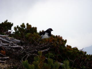 中房温泉登山口〜燕山荘テン場(6:30発〜11:10着) 夜行列車で早朝穂高駅に着く。 本シーズン前の穂高駅は、数組の登山者のみ。 中房温泉行きの乗り合いバスの乗客は、私達の他に男女数名。 人気コースとは思えないほど、閑散としている合戦尾根を行く。 合戦小屋手前から登山道は雪道となり、小屋にて持参の軽アイゼンを着ける。 白馬大雪渓を登るために購入したものの、出番の少なかった6本爪軽アイゼンは 新品同様である。 ゲレンデ脇斜面を、つぼ足で歩いた経験は結構あるが、登山靴&アイゼンはさすが に歩きやすかった。 前回登った時は、盛夏でガスっていたので何も見えなかったが、残雪の北アルプス の山々を見ることが出来て、とても新鮮だ。 燕山荘の手前で、ウシガエルのような声を聴く。 ちー隊長が、今のは雷鳥の鳴き声だというので、注意深くあたりを見てみると、雷鳥 の♂が一羽、ハイマツの中の岩の上にいた。 ![]() ♀雷鳥の鳴き声は何度も聴いたことがあるが、♂とはかなり違う印象だ。 低く太く唸るような声をあげて、縄張りでも主張しているのだろうか。 小屋で受付を済ませ、雪の上にテントを張る。 ちー隊長は、今回は外張りも使い、テント内の暖かさを保ってくれる。 ペグに取り付け、最後の仕上げ?に、ピッケルを力強く雪面に差込み、そこに出入 り口の張り綱を繋いで出来上がりー(^^)v 山ヤさんにとっては、当たり前のことだろうが、雪山初めてテント泊のハイジにとって は、ピッケルの使い方いろいろが、いちいち興味をひくものだった。 テン場は3mほどの雪が残っており、トイレは雪の下で使用できず、小屋のを使う。 昼食を済ませ、お昼寝をしていたら雨音で目が覚める。 えーーっと、予報は確か、曇りのち晴れじゃなかったっけー(^^; 風雨がだんだん強くなってきたので、山頂へは行かず、【うわばみタイム】とする。 夕方雨が小止みになったところを見計らい、すばやくトイレを済ませ消灯。 |