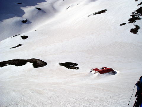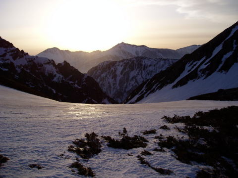 剣山荘 6:45〜10:25 剱岳 10:55〜13:25 剣山荘 14:20〜17:30 雷鳥荘(泊) 6:45 剣山荘出発。 夜通し吹き荒れ小屋を賑わわせていた風も治まり、快晴の登山日和である! ![]() 剣山荘前より鹿島槍を望む ![]() 雪に埋もれた剣山荘(赤い屋根) 小屋裏手の急斜面を、別山尾根に向けて登る。 早くも息があがり、スタートしたばかりだというのに、泣きが入ってしまう。 昨夜から食欲もなかったし、夜中は軽い頭痛がして、本当に自分でもどうしてしまった のだろうと思うほど気が弱く?なってしまった。(山歩きをして初めてである) スタートからこんなんでは、今日一日の行程を思うと、途中でリタイアするわけにいか ない、皆に迷惑をかけてしまうし、止めるなら今のうちだ。 最後尾のK氏に、『私やっぱりリタイアします。』と告げると、『スタートしたばかりだし 急斜面だから苦しいんだよ♪』『絶好の登山日和なんだし♪』と励まされる。 ![]() 別山尾根への登り 尾根に出たところで、桑原先生にリタイアを申し出る。 しかし、先生は、『ま、行きましょう♪』 『ハイジさん、私の後ろについてください』 これからますます危険なコースを行くのに、先生が私を連れて行ってくださるという 判断ならば、私は気持ちを立て直し、ついていくのみだ・・・と覚悟を決める。 一服剣を越えたほどよいところで休憩し終わる頃には、すっかり調子よくなってきた。 ![]() 前剣の雪壁 ![]() ![]() 一服剣を振返る ![]() 剱岳本峰を望む 前剣を越し、平蔵のコルから岩場となる。 雪はないが、アイゼンを着けたままの岩登りなので、アイゼンの爪をひっかけないよ う慎重に行く。 ![]() 夏道は通称・カニのタテバイが登りで、ヨコバイを下り専用ルートにしているが、この 時期は登下降共ヨコバイを利用する。 ![]() ハイジは岩場歩きは好きなほうであ〜る(^^) ![]() 雪に埋もれた山頂祠(中央奥) 10:25 剱岳山頂着。 祠は雪に埋もれており、かろうじて屋根の部分だけが見える。 陽が高くなり、春霞で遠景はぼやけてしまうものの、360°丸見えであ〜〜る(^^)v 剱岳山頂で雪を頂いた山々を目にし、これは夢ではないか・・・と、感慨深い。 今朝リタイアせずに良かった! 励ましてくださったK氏、登らせてくださった桑原先生に大感謝で〜す! 10:55 下山開始。 慎重に下り、13:25 剣山荘着。 アタックのために預けておいた荷物をザックへ詰めなおし、行動食でお腹を満たしたり 水分補給したりする。 14:20 剣山荘発。 剣沢を登り返し、別山乗越手前の、剱岳の絶好のビューポイントにて休憩する。 ![]() ![]() 剣沢テン場と剣沢小屋 剣御前小屋前は、スキーヤーで賑わっていた。 スキーを担いで雷鳥坂を詰めてきて、ここからひと滑りで雷鳥沢である。 私達は坂の上部で滑落停止の講習を受け、シリセードを教わりながら雷鳥坂を 一気に下る。(とっても盛り沢山の登山講習であ〜る♪) 本日の仕上げに、雷鳥荘へのきつい登り返しが待っていた(^^; 17:30 雷鳥荘着。 夕食時は勿論、生ビールで祝杯をあげる(^^)v |