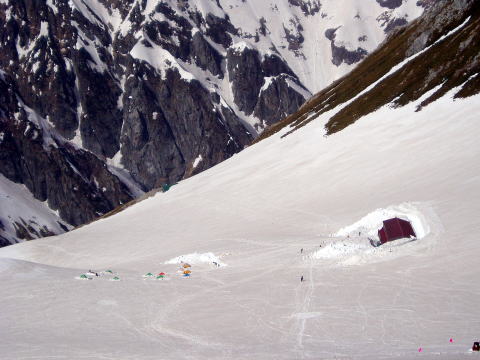 室堂12:00〜12:25 雷鳥荘 12:45〜14:15 剣御前小屋 14:35〜 15:30 剣山荘(泊) 前夜新宿駅にてピックアップしてもらい、車中仮眠の後、扇沢よりアルペンルートに て室堂へ。 現地集合のKI氏、KA氏と合流し、小雨の中出発する。 明日の宿・雷鳥荘へ寄り、着替え&お風呂セットを預ける。 12:45 行動食を取り、アイゼンを着け、雷鳥荘出発。 みぞれ混じりの雨とガスで、視界不良である。 ハイジは無雪期に別山尾根より剱岳を登頂したことがあり、今山行に備え雪山登山 ルートガイドにてシュミレーションをしていた。 夏道でも急坂の雷鳥坂を登り返すのだが、夏道コースタイムは二時間二十分とある。 講習の予定表には二時間とあり、一時間で一回休憩があると勝手に思っていた。 視界不良の雨の中、ハイジの滅入る気持ちと足時計は一時間はとうに超えており、 息もあがり、苦しく、慣れたペースと違うので、だんだん不安になってきた。 剣御前小屋に着く前にこんな調子では、この先が思いやられ、メンバーに迷惑をか けてしまう・・・。病みあがりだし、私には体力的にも無理だったんだ・・・。 登りつめた小屋まで頑張って、着いたらリタイアを申し出よう。と思いながら歩く。 14:15 剣御前小屋着。 半べそかきながら?、桑原先生にリタイアを申し出ると、『ここからは剣沢を下るだけ、 三十分も歩けば剣山荘だから心配しなくても大丈夫ですよ♪』、『休憩したら回復しま すよ♪』とのお言葉が。 息を整えよく考えてみると、確かに下るだけだ(^^) それに雷鳥沢からひと登りで(一時間半)ここまできたのだから、苦しくて当たり前な のだぁ(^^;) メンバーの方々にも励まされ、剣山荘へ向かう。 当初の予定では小屋前にて雪上訓練講習があるはずであったが、雨のため中止し 小屋にて寛ぐ。 十年来の生徒さんだというKA氏が、背筋をピンと伸ばし、慣れた手つきでお茶をたて 、皆に振舞ってくださった!!・・・(^^) 夕食後、ロープワークを習う。 明日は出発からロープで繋がれながらの行動になる。 八の字、クローブヒッチ、セミクローブヒッチと、基本三種類を教わる。 頭の悪いハイジは覚えが悪く、隣のKA氏に何度も何度も丁寧に教えていただいた おかげで、三種類きっちり覚えることができた(^^)v KA氏ありがとうございま〜す! |