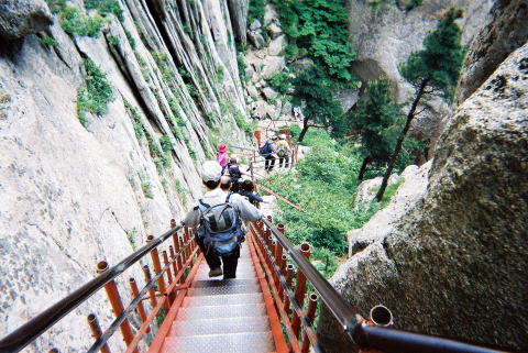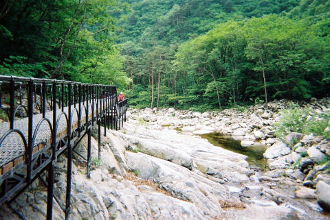 雪嶽山国立公園管理事務所 8:35〜9:35 継祖庵 9:45〜10:25 蔚山岩(ウルサ ンバウイ) 10:30〜10:55 継祖庵 11:10〜12:10 雪嶽山国立公園管理事務所 8:10 高速バスターミナル前のタクシー乗り場にてタクシーに乗り、国立公園管理事 務所Pへ向かう。(タクシー料金:12,600ウォン) 8:30 入口ゲート前着。入園料(神興寺地区を通るため)、一人/2500ウォン支払う。 ![]() 雪嶽山国立公園管理事務所ゲート(画像:T氏提供) 8:35 ゲートを通り出発。 ロープウェイの架かる権金城山が目を惹く。あたり一帯は雪岳小公園と呼ばれており、 家族連れなど観光客で賑わっている。 ![]() 権金城山とシンボル・月ノ輪熊像(画像:T氏提供) ![]() 標識はハングルと英語のみ ちー隊長&K氏 ↓ウルサンバウイ ![]() 統一(祈願)大仏 ![]() 神興寺と権金城山 雪岳小公園地区を過ぎると、静かなハイキングルートだ。 明日縦走の終点で合流するあたりだ。 ![]() 道標に導かれながら緩やかな道を行く。 適当なところに(見晴らしのいい場所)売店兼休憩所があり、飲食できるようだ。 呼び込みも激しい(^^; 9:20 内院庵通過。 濃い緑のトンネルが続く道は広く、整備され歩きやすい。 トンネルが切れた所で目の前に、ウルサンバウイがド〜〜ンと現る!! ![]() ウルサンバウイ 9:35 継祖庵(小休止) ![]() 継祖庵(画像:T氏提供) フンドゥルバウイ(揺れ岩)は、地元の人々に大人気。記念写真を撮る人達で賑わしい。 ![]() 揺れ岩(画像:T氏提供) 9:45 継祖庵出発。 ここからすぐに樹林帯を抜け、ウルサンバウイが迫ってくる。 クライミングのルートが沢山あるようだ。 ![]() (画像:T氏提供) ここからが本日の面白いところで、 いかにもな岩の塊を、我らハイカーが登れるよう に道?は整備されている。 ↓見てくださ〜〜い!この階段!! ![]() 写真では分りづらいかもしれませんが、とっても急傾斜の階段がついているのです。 頂上まで休まずに登りきったら、貴方の脚力は相当なものでしょう状態です(^^; ![]() 振り返ると目がくらみます(~ ~) ![]() 頑張って休まず登り続け、力尽き気を抜いて手摺に捕まらず振り返ろうものなら、 まッ逆さまにイってしまいそうです(^^;; ![]() しかし、こんな階段道をよくぞ作ったものです。北漢山(ソウル近郊)にも、山頂部 手前には鉄階段があったが、ここまで急ではなかったし、当然長くもなかった! ウルサンバウイハイキングの醍醐味は、この階段道に尽きると思う。(キッパリ!) 10:10−15 小休止。一気に山頂目指したかったが、狭い階段道&先行者とのペー スの関係でままならず。 コースからちょっと逸れた岩の上で休んでいると、シマリスがチョロチョロと足元をか すめて行くので癒される(^^) ↓ウルサンバウイ(蔚山岩) 875m ![]() 立入り禁止の山頂を望む ↑今回の山頂 10:25 ウルサンバウイ山頂着。 槍ヶ岳の山頂くらいの広さだ。そこに売店があり、 コーラや記念品のメダルや土産 物等が売っていた。売店のお兄さんは、山頂記念写真を撮る人々のシャッター係とな り、人で溢れかえる山頂整理係と化していた。 生憎遠景は霞んでしまい望めないが、達成感はあった(^^)v。 霞の中に時折浮かぶ稜線のどれかは、明日歩く尾根だ。 我らもシャッターを押してもらい、早々に退散する。 10:30 山頂出発。 超急傾斜階段は、下りはスリル満点です!そのスリル感は、ジェットコースターコース を自分の足で行くカンジ・・・。イェ〜イ♪(^^) ![]() 10:55 継祖庵着。(大休止) 鬼階段の感想など語り合いながら寛ぐ♪ 11:10 出発。来た道を戻る。 ![]() 雪岳小公園より望む権金城山 12:10 国立公園管理事務所P着。 |