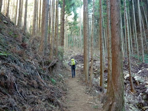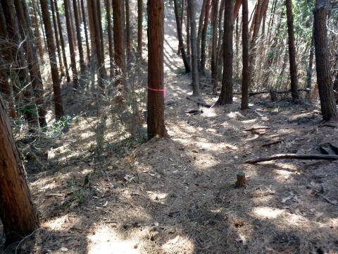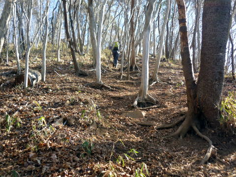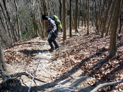 こどものもり公園P 9:30〜榛名山〜男山〜10:40 本山 10:45〜飯盛山〜11:55 高館山 12:10〜黒戸山〜12:50 兜山 12:55〜大網集落〜14:00 こどものもり公園P 9:20 こどものもり公園P着。広い駐車場は平日ながら1/3位埋まっていた。 9:30 こどものもり公園P出発。(公園ゲート手前にトイレ棟あり) 下山して気付いたのだが、駐車場から榛名山&男山方面への登山道があったが、我らは 出発時に気付かず、公園内アスファルトの道を5分程歩き、途中から道標に導かれ、登山 道に入る(^^; ![]() 公園ゲート 杉林の緩やかな道を行く。15分程で駐車場からの道と合わさる。 ![]() 10:05 稜線へ出た。道標によると、榛名山はここから右へ、男山へは、左へとある。 我らはとりあえず最初の山・榛名山を目指す。 山頂手前一段上がった所で、麓からダイレクトに榛名山へ至るコースと合流。 10:10 榛名山(524m)着。写真を撮り通過。 ![]() 日光連山がくっきり&ハッキリ、近くに見える♪ 来た道を戻り、男山へ。男山は縦走路から一旦左へ逸れた先にある。 緩やかな道は、男山直下・5mほど急登だ(^^) ![]() 男山直下の急登 10:20 男山(527m)着。写真を撮り通過。 ![]() 男山より望む女峰山 ![]() 男山より望む高原山方面 縦走路は小さなアップダウンを繰り返す。道は良く踏まれており歩きやすい。 10:30 縦走路から右下一段下がった所に、金鉱山入口跡があった。 ![]() 金鉱山入口 ![]() 縦走路より望む筑波山 ![]() 本山手前はやや急な道 10:40−45 本山(561.6m) 小休止。 ![]() ![]() 本山より望む榛名山(左)と男山(右) 本山からは、今までで一番大きく下る。 ![]() 11:05 分岐標識通過。 鉄塔の脇を、飯盛山へ向け登り返す。本日一番の急登だ。 11:20 飯盛山(501m)着。 写真を撮り通過。 ![]() 木に囲まれ展望イマイチ(^^; ![]() 飯盛山より望む高館山 飯盛山から、また大きく下る。 本日の核心部は、ロープの張られたザレの超急坂だ。慎重に通過する。 ![]() 写真よりも実際はもっと急な斜面! 宇都宮アルプスは、飯盛山までが篠井連峰で、高館山〜兜山までが富屋連峰となって いる。多くのハイカーは、青嵐峠から駐車場へ戻る周回山行をしているようだ。 11:35 青嵐峠通過。今まで道標が整備されていたが、ここからはやや不案内になる。 11:55−12:10 高館山(476.7m) 大休止。(ソイジョイ・ホットレモン) ![]() 山頂は平坦な広場だ ↓榛名山 ↓男山 ↓本山 ![]() 高館山より望む(左奥は女峰山) 高館山から緩やかに下り、黒戸山へ。今までよりも道標が不案内である。 12:30 黒戸山(412m)着。写真を撮り通過。 ↓男体山 ↓榛名↓男山↓本山