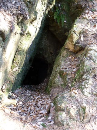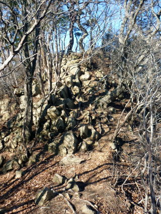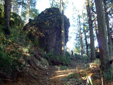 兜山への案内板はなく(多分見当たらなかった?)、大まかに狙いをつけて行くことに(^^; 道は中徳次郎登山口方面に付いている。 12:40 アスファルトの林道に出た。(下画像参照) ↓赤丸付近が兜山登山口 ![]() 林道を下り中徳次郎登山口方面へ行ってしまうと、駐車場まで遠回りだし、兜山への案内 は全くなく戸惑ったが、ちー隊長が林道を遡り、兜山の登山口を見つけた。(案内板あり) ![]() 大岩を回り込むと兜山山頂だ 12:50−55 兜山(372m) 小休止。