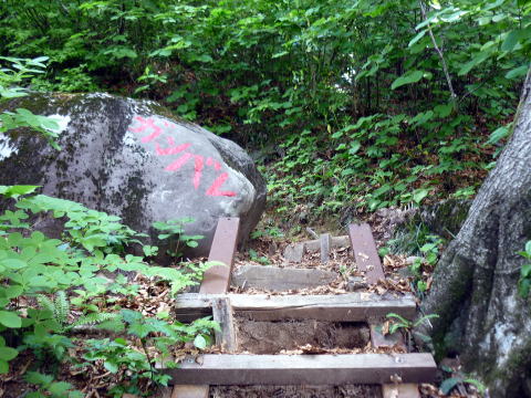12:50 711m峰通過。 ![]() 南側視界が開ける711m峰 711m峰からは、一旦下り登り返す。直登ぎみの木の階段が続く。 13:20 ガンバレ岩通過。 ![]()